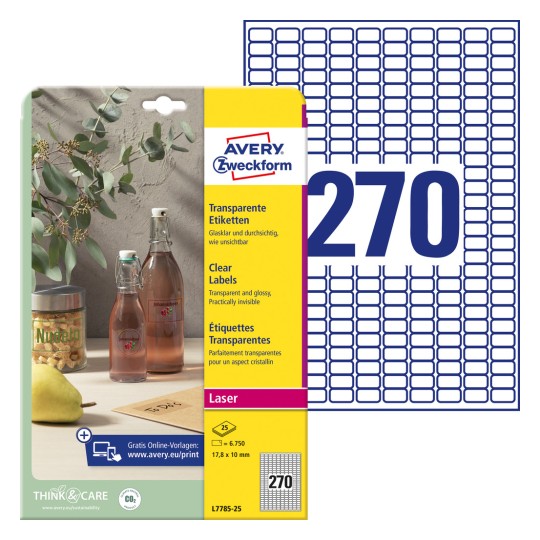 The crystal clear labels L7784-25 with the format 210x297mm from AVERY will give you that printed-on look on shiny surfaces. 25 transparent polyester film labels on 25 sheet per pack. The crystal clear, transparent labels are perfect for labellien glas, plastic, metal and shiny surfaces. The labels are oil-, dirt- and temperature resistant (-20°C to +80°C), spraywater- and tearproof. Design and print your labels the quick and easy way - for the free AVERY templates and software please visit www.avery.eu or use the templates integrated in the Microsoft® Office packages. Suitable for all standard laser- and colour laser printers.