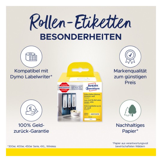 The white, permanent adhesive roll labels AS0722470 in the format 38x190mm von AVERY eignen sich besonders zum Beschriften von Ordnern. TheOrdneretiketten sind 100% kompatibel mit dem Dymo® Labelwriter™ LW310, LW330T, LW400 series, LW450 series and the Seiko Smart LabelPrinter®. These roll labels match the Dymo® article S0722470/Seiko® article SLP-FN. 110 labels on roll per pack. The roll labels with reliable and very strong adhesion well above average (adhesion test FTM2 and FTM9 on all standard surfaces) are free of bisphenol A (BPA). AVERY guarantees complete satisfaction or you will get your money back (100% money-back guarantee, see www.avery-zweckform.de for terms and conditions)! Design and print your filing labels one-at-a-time or several at once - it is so easy and quick with your Dymo® or Seiko® software.