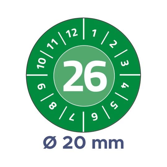 The green inspection plates 6945-2026 in the round Ø20mm format from AVERY are extra safe with nopeel- and anti tamper features. 120 inspection plates on 8 sheet in a practical dispenser booklet. The inspection plates with 12 months and the years 2026 can only be removed in small parts, making a transfer of the plate impossible. With these labels you can actively prevent manipulation. They are ideal for the individual and easy on-site labelling of inventory and property, simply use a marker pen. The inspection plates stick to many surfaces and are resistant to water, oil, cleaning agents, desinfectants and solvents.