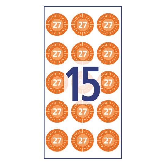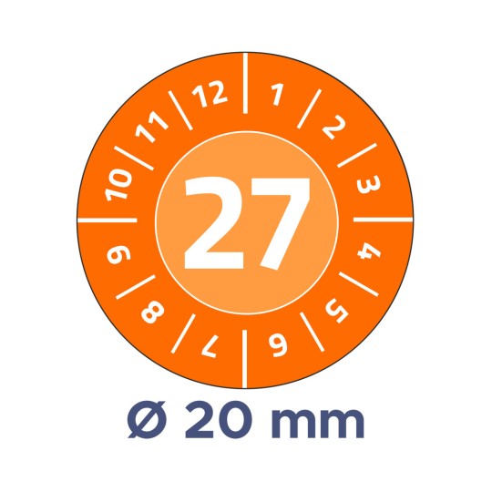 The orange inspection plates 6945-2027 in the round Ø20mm format from AVERY are extra safe with nopeel- and anti tamper features. 120 inspection plates on 8 sheet in a practical dispenser booklet. The inspection plates with 12 months and the years 2027 can only be removed in small parts, making a transfer of the plate impossible. With these labels you can actively prevent manipulation. They are ideal for the individual and easy on-site labelling of inventory and property, simply use a marker pen. The inspection plates stick to many surfaces and are resistant to water, oil, cleaning agents, desinfectants and solvents.