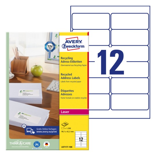 The off-white recycling address labels LR7177-100 for laser printers in the format 99,1 x 42,3mm. 1200 address labels on 100 sheet per pack. The labels are made of chlorine-free bleached recycled paper.