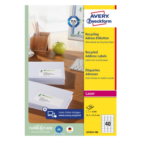The off-white recycling address labels LR7654-100 for laser printers in the format 47,7 x 25,4mm. 4000 address labels on 100 sheet per pack. The labels are made of chlorine-free bleached recycled paper.