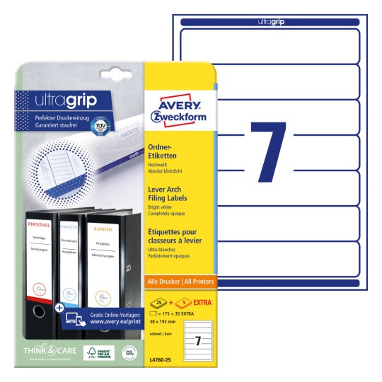 The Recycled Lever Arch Filing Labels LR4761-10 in the format 61 x 192 mm from Avery are perfect for labelling lever arch files. 4 Recycled Filing labels on 10 sheet. The labels are made of chlorine free recycled label paper. There are no emissions during production and production waste ist completely recycled. The Lever Arch Filing labels are compatible with most standard laser- and inkjet printers and copiers.