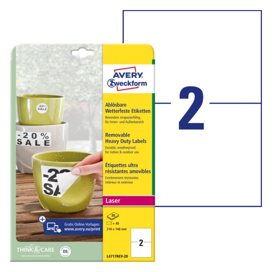 Averys avtagbara, slitstarka etiketter passar bra när du tillfälligt behöver hållbar märkning av olika föremål. Eller för skyltning utomhus där informationen bara gäller under en kortare tid och etiketten därefter enkelt ska kunna tas bort utan att använda lösningsmedel. Avery avtagbara, slitstarka etiketter uppfyller båda kraven. Etiketterna är tillverkade i ett slitstarkt och hållbart polyestermaterial som inte kan rivas sönder. Etiketterna klarar olja, smuts, vatten, fukt, UV-strålning och temperaturer från -20 °C till +80 °C, vilket gör etiketterna perfekta för utomhusbruk i alla väder och inomhusbruk i miljöer som kräver hög hållbarhet. Dessutom är etiketterna tillverkade med ett klister som gör etiketten avtagbar utan att det lämnar märken av limrester eller märken efter etiketten. Användningsområdena är oändliga, passar bland annat perfekt för handelsträdgårdar och plantskolor med mera, för prisskyltning, blomsterbehållare och andra utomhusskyltar. För lagerändamål som märkning av hyllkanter, lådor, boxar osv. Marknadsföringsmaterial för utomhusskyltning som ändras regelbundet mm. Avery L4717REV-20 avtagbara, slitstarka etiketter med 2 etiketter/ark och 40 etiketter/pkt med ett etikettmått på 199,6 x 143,5 mm. Etiketternas storlek är avsedd för stora föremål och skyltar. Etiketterna kan skrivas ut med alla laserskrivare och färglaserskrivare. Den höga papperskvaliteten ger vackra och skarpa utskrifter. Averys JamFREE™-garanti säkerställer dessutom att du inte behöver bekymra dig för om etiketterna fastnar i skrivaren och orsakar stopp. Du kan enkelt och lätt designa och skriva ut med gratisprogrammet Avery Design & Print på www.avery.eu ... följ stegen på skärmen så får du hjälp genom hela design- och utskriftsförloppet. Programmet innehåller dessutom många fördesignade komponenter som enkelt kan anpassas efter eget behov.