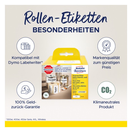 Avery's A1933087 on a roll for label printers correspond with the DYMO® 1933087, and are 100% compatible with the DYMO® LabelWriter ™ LW310, LW330T, LW400 series, LW450 Series, 4XL and LW Wireless. With this pack, you get Avery's well-known quality label at a very attractive price. The pack contains 1 roll with 170 labels measuring 59 x 190 mm.