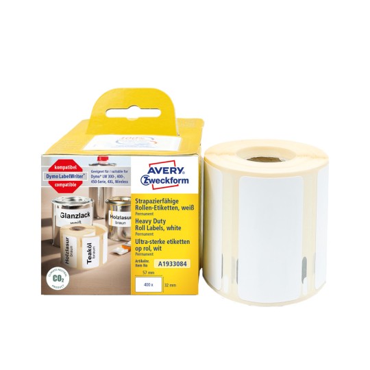The strong, white, permanent adhesive polyester labels A1976411 on rolls in the format 25 x 54 mm from AVERY are perfect for outdoor usage and in production and warehouse areas. The strong labels are 100% compatible with the Dymo® Labelwriter™ LW330T, LW400 Serie und LW450 Serie. These roll labels match the Dymo® article 1976411. 1 roll with 160 labels per pack. The strong permanent adhesion makes them perfect for weatherproof, reliable and durable labelling. The labels are oil-, dirt-, UV- and temperature resistant (-20°C to +60°C) and water- and tear proof. They are significantly more hard-wearing than standard paper labels. Optimum suitability for laser printers. AVERY guarantees complete satisfaction or you will get your money back (100% money-back guarantee, see www.avery-zweckform.de for terms and conditions)! Design and print your address labels one-at-a-time or several at once - it is so easy and quick with your Dymo® Software.